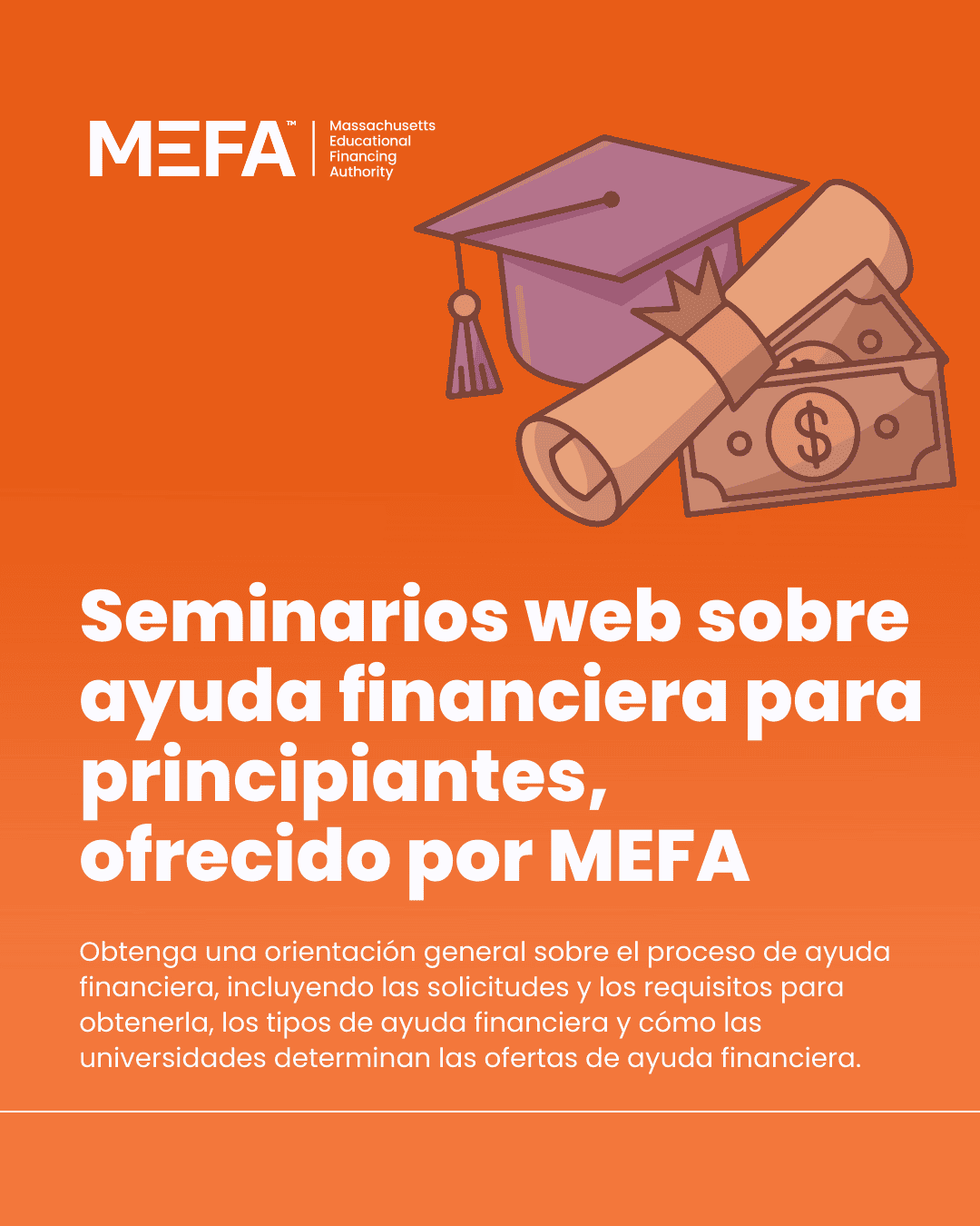 ¿Tienes preguntas sobre la ayuda financiera? Los expertos de confianza de MEFA ofrecerán seminarios web gratuitos sobre la ayuda financiera este otoño. Regístrate en bit.ly/4pqSIp5.