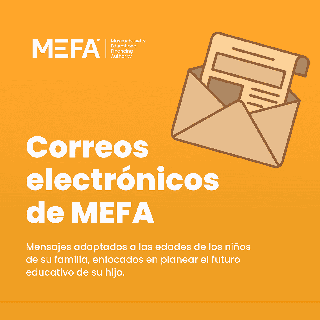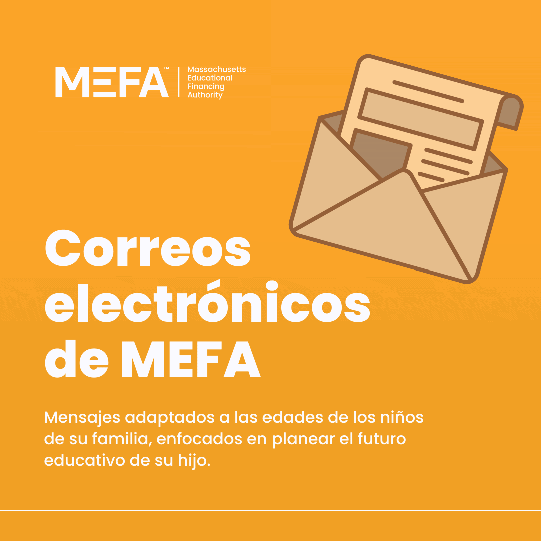 ¿Le gustaría recibir correos electrónicos con consejos útiles y oportunos para planificar los estudios universitarios y mantenerse al día? MEFA ofrece información sobre cómo planificar, ahorrar y pagar los estudios universitarios adaptada a la edad de sus hijos. Regístrese en mefa.org/sign-up.