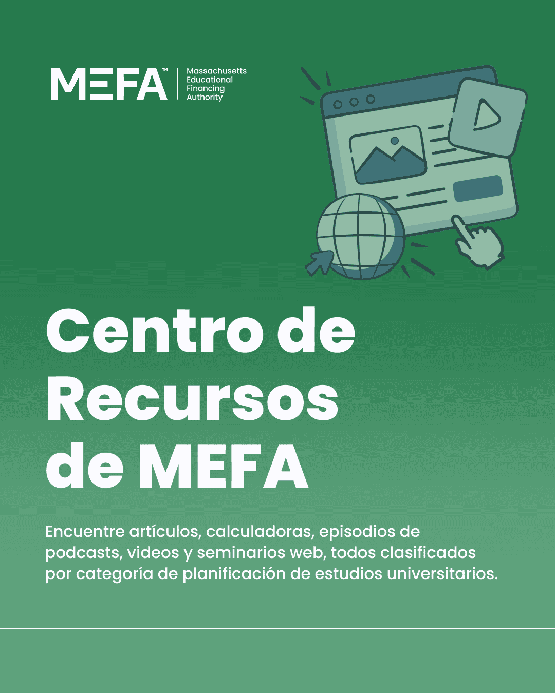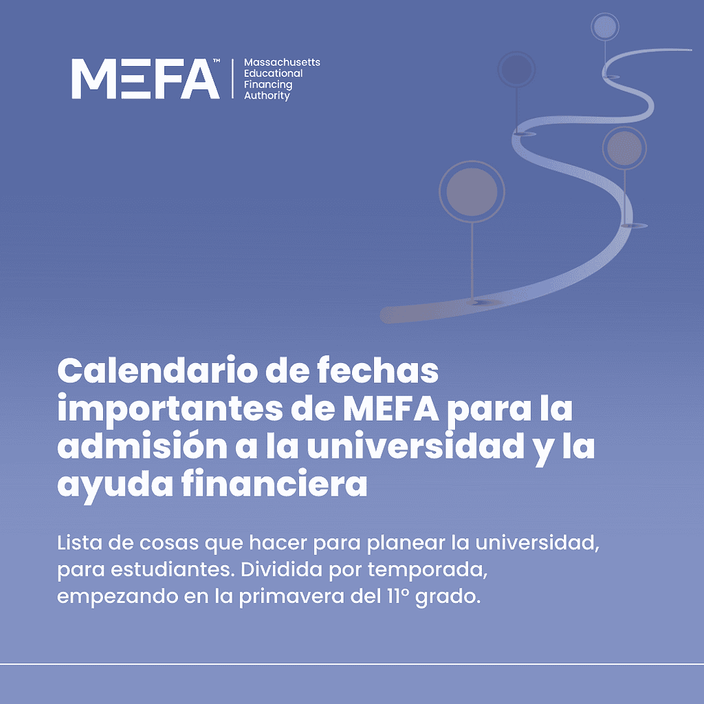 MEFA tiene toda la información que necesitas para planificar tus estudios universitarios. Explora nuestro Centro de Recursos para acceder a episodios de podcasts, videos, artículos, seminarios web y calculadoras. Empieza en mefa.org/resource-center.