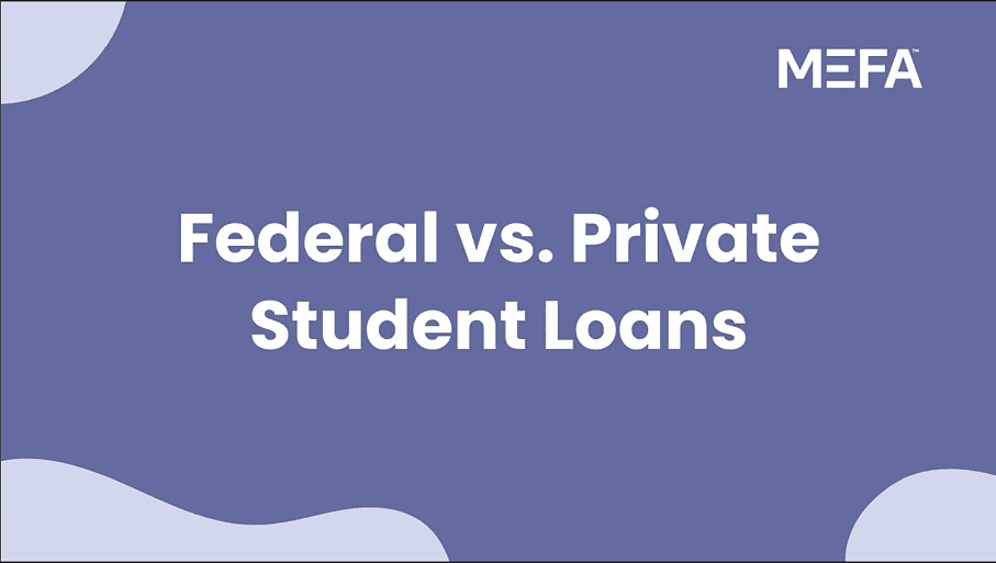 Learn the difference between these two types of student loans. Federal student loans are given by the federal government and are available to any student who files the FAFSA. They have the same interest rate for every student and offer various income-driven repayment plans. Private loans come from banks, credit unions, and state-based lenders. They require a credit check, offer an interest rate based on credit score, and have stricter repayment terms. For more information, read MEFA’s article, Private Student Loans vs. Federal Student Loans: What’s the Difference?